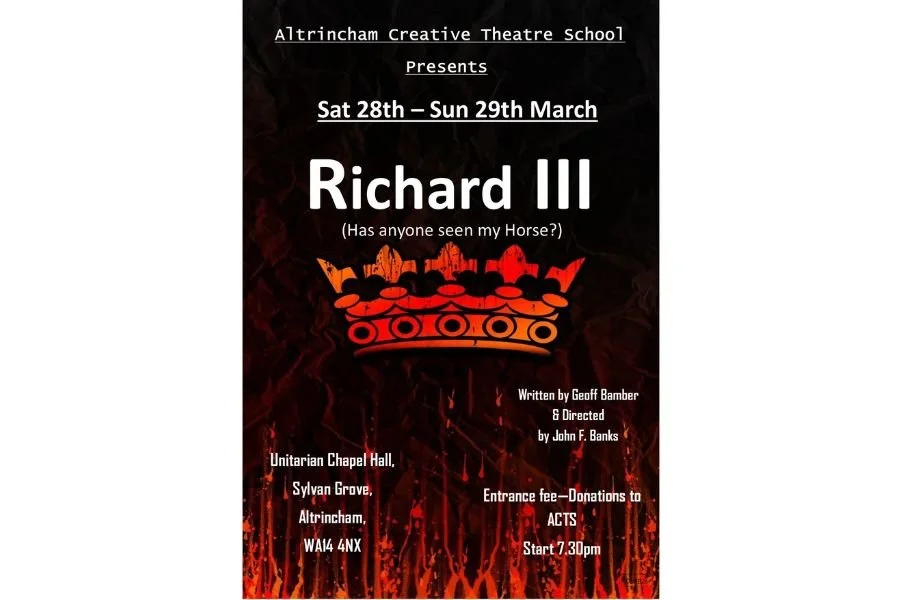 This March, Altrincham Creative Theatre School (A.C.T.S) will be performing their main production ‘Richard III – Has anyone seen my Horse?’ on the 28 and 29 March at the Unitarian Chapel Hall in Altrincham. This is a light hearted and condensed version of Shakespeare’s well-known play ‘Richard III’.